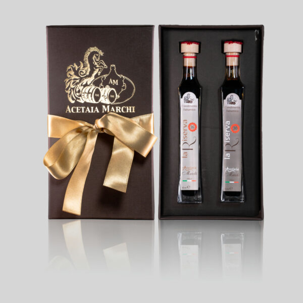 This elegant gift box contains two highly prized Balsamic Condiments: the “Riserva 16” and the “Riserva 30.” These products stand out at first glance for their intense, clear and brilliant black color. Then, from the first taste, they captivate with their balanced and pleasantly acidic flavor, accompanied by a fragrant scent with accentuated Balsamic notes.