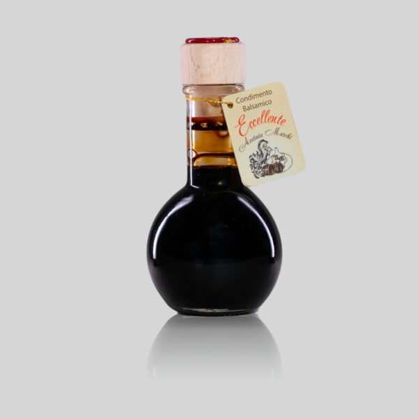 Nous pouvons définir ce condiment balsamique comme une véritable plume dans le chapeau des collections de la famille Marchi. Son goût harmonieux, plein, rond, intense et enveloppant permet de mettre en valeur tout type de plat, en donnant toujours une touche d’élégance au plat. Le produit est disponible dans l’élégant flacon de 100 ml en forme de tube à essai sphérique.