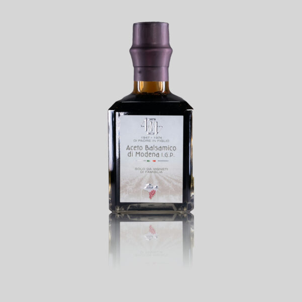 La qualité de ce produit est encore renforcée par les raisins qui proviennent exclusivement de nos vignobles familiaux, situés dans la belle campagne des environs de Modène. Cultivés depuis le début du XXe siècle par les familles Marchi et Cioni, ces vignobles racontent une histoire de passion et de dévouement qui s’est transmise de génération en génération. Chaque goutte de vinaigre balsamique de Modène IGP Argento renferme l’essence d’une terre riche en traditions et le fruit d’un engagement constant pour garantir la plus haute qualité.