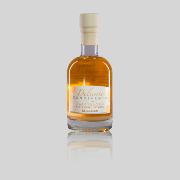 Questo prodotto unico nasce dall’arte della miscelazione, unendo la dolcezza naturale del mosto concentrato — ottenuto attraverso un delicato processo di evaporazione sottovuoto che preserva il suo luminoso colore chiaro e le fresche note fruttate — all’acidità vivace dell’aceto di vino bianco.